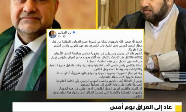 وقال الملالي في منشور عبر صفحته في فيسبوك، “تمكّنا من تسوية جميع الدعاوى المقامة من قبل مطار النجف الدولي بحق الشيخ فائد الشمري، بعد جهد قانوني وإداري استمر فترة طويلة”.