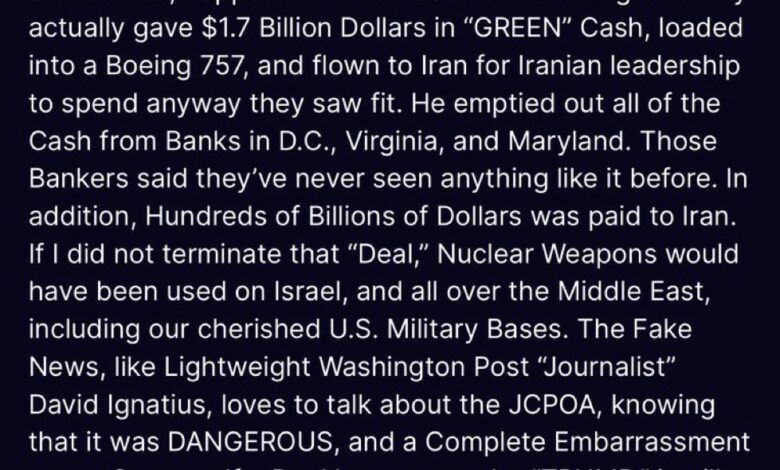 ولو لم أقم بإنهاء ذلك “الاتفاق”، لكانت الأسلحة النووية قد استُخدمت ضد إسرائيل وفي أنحاء الشرق الأوسط، الإعلام المضلل، مثل صحفي “واشنطن بوست” الخفيف الوزن David Ignatius، يواصل الحديث عن الاتفاق النووي رغم علمه بأنه كان خطيرًا ويمثل إحراجًا كاملًا لبلادنا.