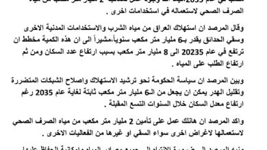 العراق الاخضر:الاستهلاك المدني من المياه سيرتفع في عام 2035 الى 8 مليار متر مكعب اعلن مرصد العراق الاخضر ارتفاع الاستهلاك…