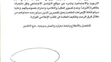وزير التربية: محاسبة صارمة لأي محتوى يخالف القيم التربوية ومنع تصوير الطلبة تحت أي ظرف وجّه وزير التربية وكالة الدكتور…